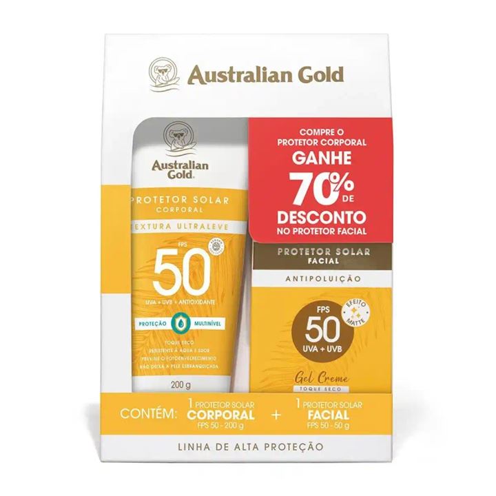 Kit Australian Gold Alta Protecao FPS 50 Protetor Solar Corporal Ultraleve 200g + Facial Gel Creme Antipoluicao 50g